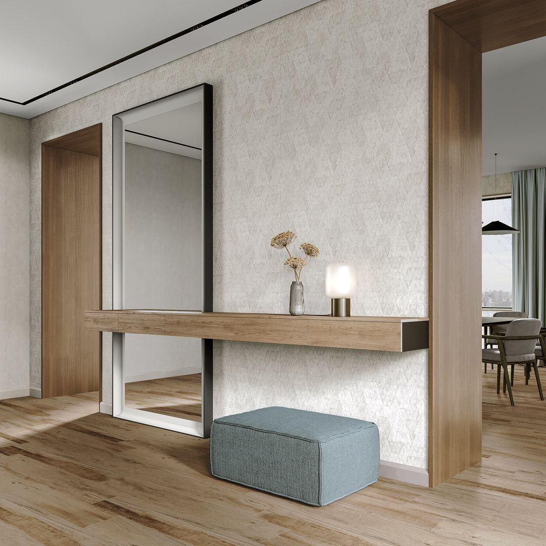 Помимо пяти мотивов, в серии представлены и фоновые обои — они воспроизводят уютный текстиль с эффектом сдержанного блеска. Мягкость линий фоновых обоев отлично дополняет геометрическую строгость мотивов: такой «дуэт» отлично сработает в гостиной или спальне, где одновременно важно выдержать стиль и обеспечить комфорт.