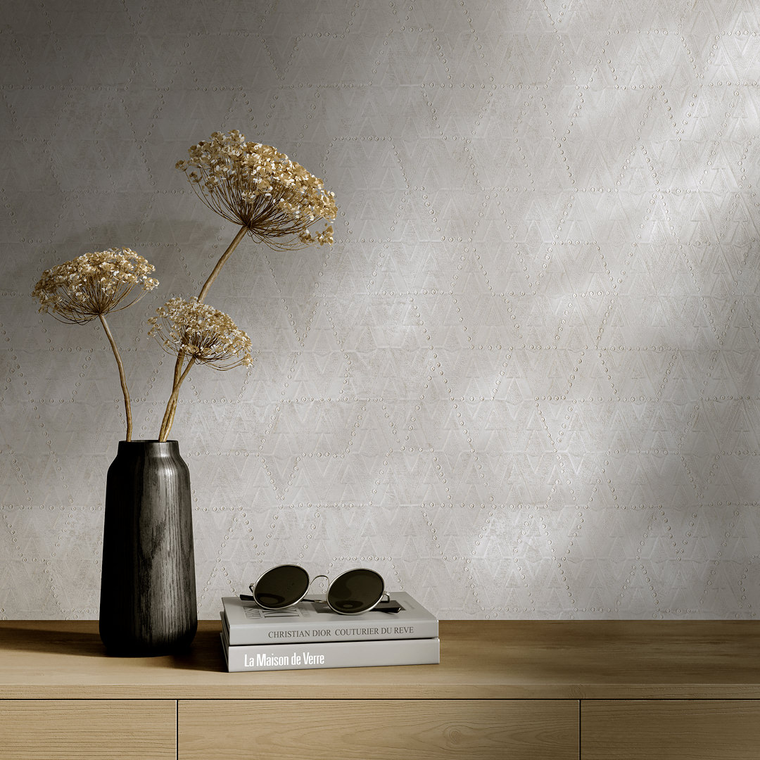 Эффект металлического блеска достигнут за счёт применения перламутра на более светлых рулонах и золота — на мотивах с более глубоким цветом. Тиснение придаёт покрытию объём и делает стильный геометрический рисунок по-настоящему выразительным.